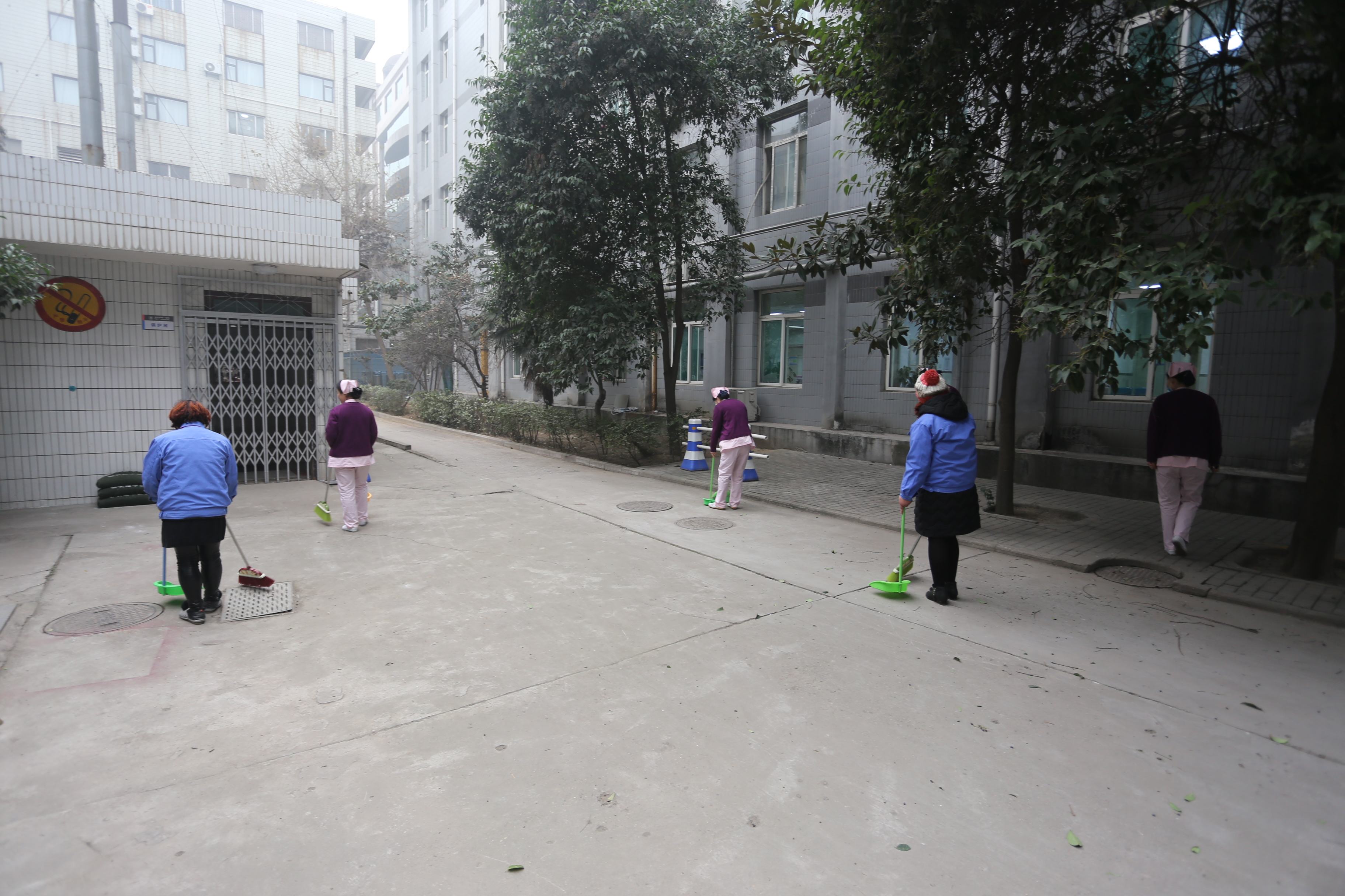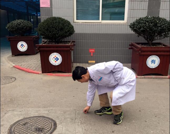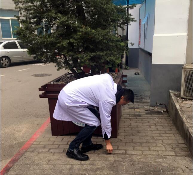 仪式结束后,控烟代表、保洁员代表和青年志愿者分组前往院内外划分区域捡拾烟头,并对吸烟者进行劝阻,指引前往指定吸烟区吸烟。