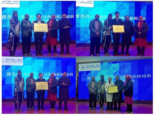 张世明院长及部分院领导为四名苏丹医师颁发结业证书,祝贺他们学有所成回国后化身为苏丹的“光明使者”,继续播撒爱与光明,继续传递深厚情谊!四名苏丹医师也特别制作感谢信献给成人导航