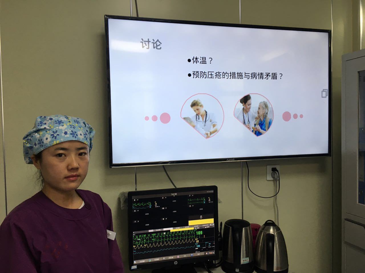 护理查房病例为女性,26岁,诊断为脑干出血、高血压3级(很高危),首先由重症医学科护士长刘红介绍了“脑干出血”的疾病概况,然后由该科责任护士杜欢对患者基本情况、治疗措施以及相关信息,汇报以PPT形式进行。在此过程中杜欢护士提出该患者的疑难护理问题,吸引在场不同层级的护士积极讨论发言并提出了护理措施方面的建设性意见,还有的护士表示可以帮助重症医学科解决降温毯等该患者急需的医疗设备。该患者因病情所需采取被迫体位,心血管总护士长齐银芝特别强调了预防压疮的重要性,并给出了固定头部,下半身30度垫起,使用气垫床可以相对延长翻身时间等护理措施;内科总护士长孙富英提出患者没有应激性溃疡的情况下,应尽早鼻饲进食,提高患者的抵抗力;大外科王卫妮、EICU赵敏、CCU张迪等老师都做了发言,对此次查房提出了宝贵的意见,使护理目标更加明确。各位护士长就大家的难点进行了解答。