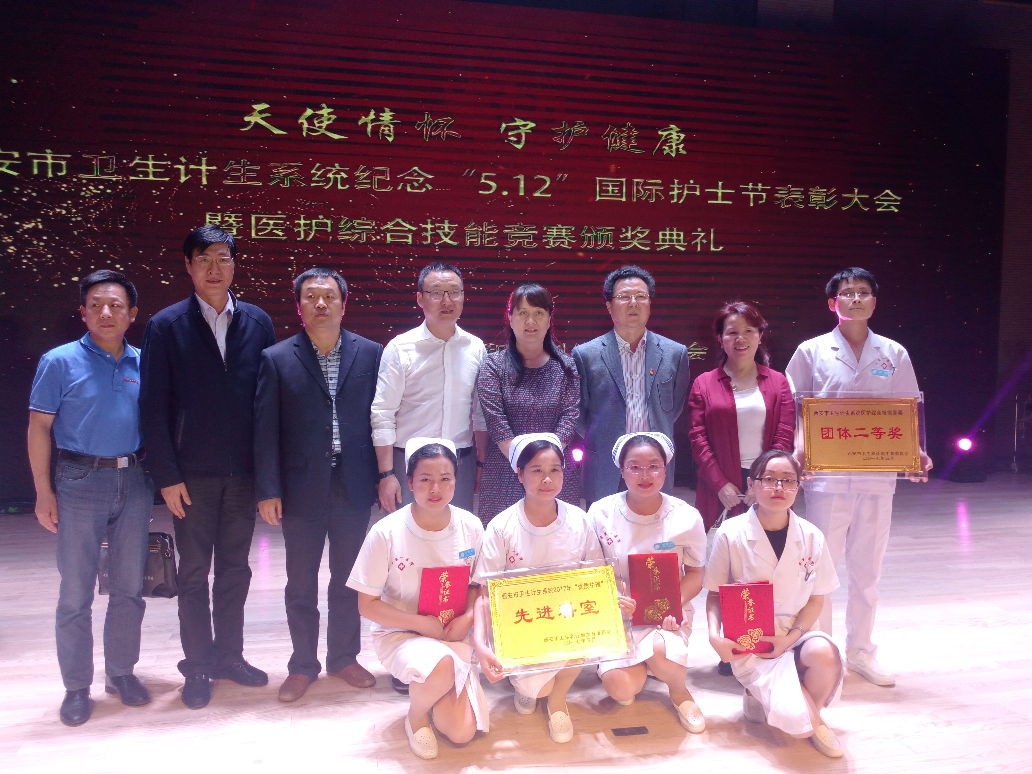 医护团队荣获西安市卫计委2017年医护技能综合竞赛集体二等奖,护士杨琪荣获个人二等奖,护士雷婵娟、医生杨渊博荣获个人三等奖。急诊重症监护室医护团队是唯一代表西安市卫计委23个竞赛代表队在颁奖典礼上展示的一支队伍,她们沉着冷静、配合默契,措施到位,操作规范,她们出色的表现给现场所有的观众留下深刻了的印象。