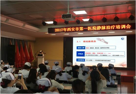 为了响应国家卫生计生系统中国社会福利基金会919护士关爱金组织的“全国针刺伤防护公益活动”,陕西省护理学会携手广大静疗实践者,通过在陕西省内发起“标准、安全、关爱”由您践行活动,加强护理人员对静脉治疗护理新理念、新规范、新技术的理解,提升职业责任感,践行标准来保证患者输液安全和医护人员的职业防护安全。邀请了成人导航静疗组组长、陕西省静疗委员会副主委、干部楼总护士长杨秋芬、干三病区护士长赵英进行静脉治疗培训授课暨院外专家进行行业新标准解读。