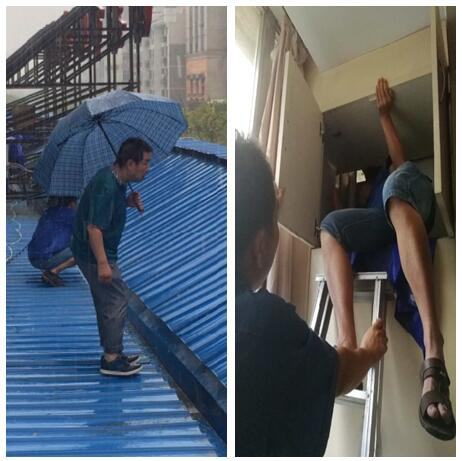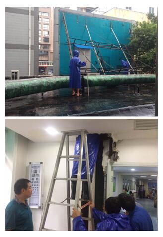 内出现多处积水、渗漏现象,总务科紧急安排维修组人员进行全员巡查防汛。