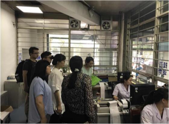 在收费处,邓院长一行对现金及医保卡缴费挂号流程进行观摩,收费处相关工作人员也对流程及操作进行了现场演示和讲解。