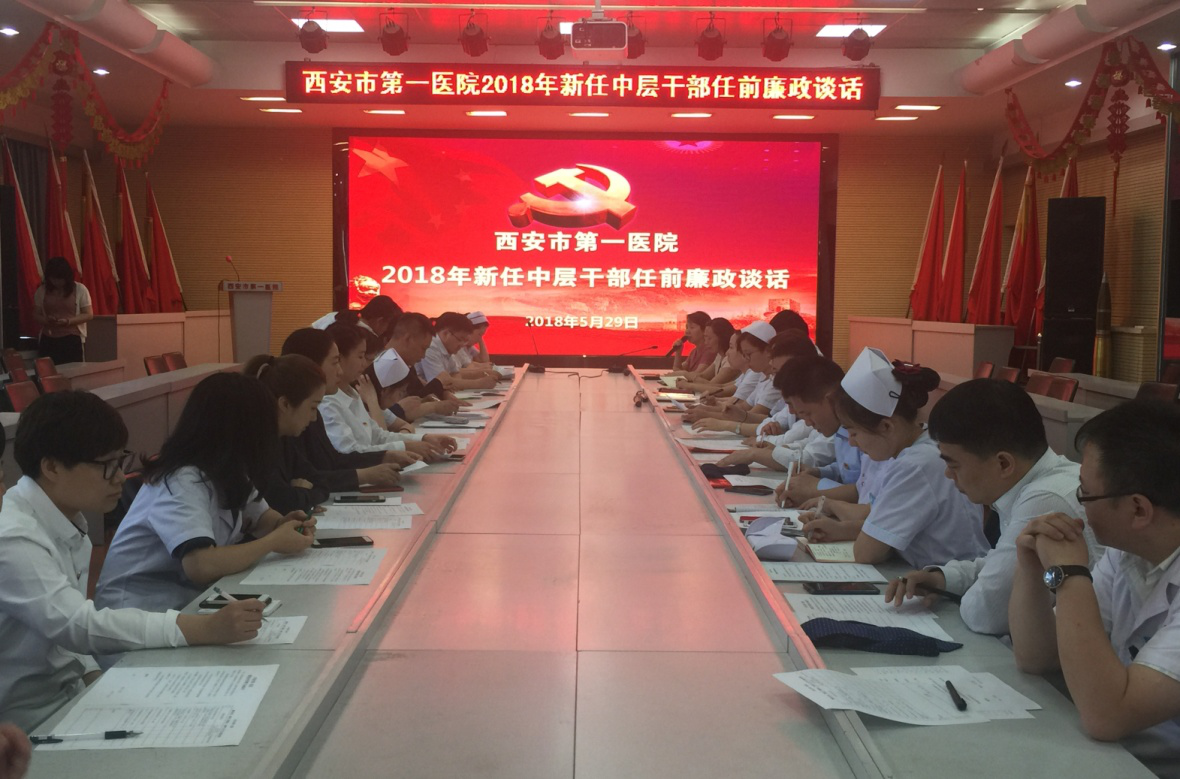 2018年5月29日下午,院纪委在心血管五楼会议室对2018年新聘任中层干部进行任前廉政集体谈话,纪委书记白敏芳、纪委监察室人员及新任33名中层干部参加此次谈话。
