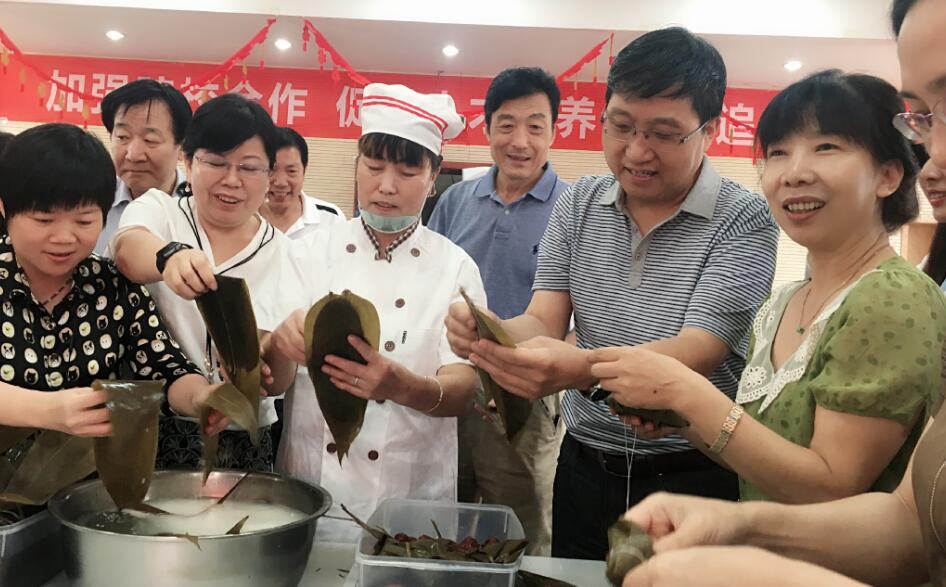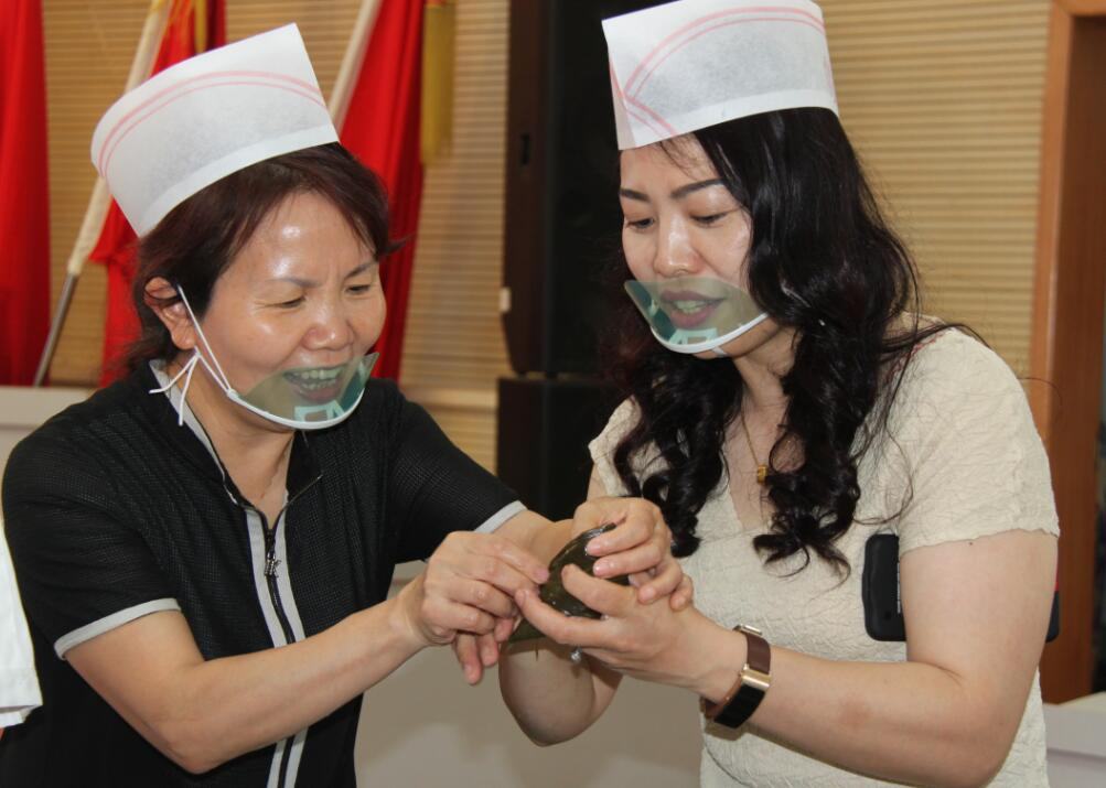 6月15日上午,院领导班子及部分行政职能科室人员,在食堂工作人员的专业指导下,纷纷动手参与包粽子。营养食堂提前准备好了糯米、红枣、粽叶等包粽子的材料,大家拿起两片粽叶叠加,折出三角,再填入糯米、红枣,将粽叶下折,翻转系绳,一个个饱满厚实的粽子就在手中成型。许多人现场学艺,边包边讨论怎样包出来既不漏米,还能好看又饱满,活动现场洋溢着浓郁欢乐的佳节气氛。