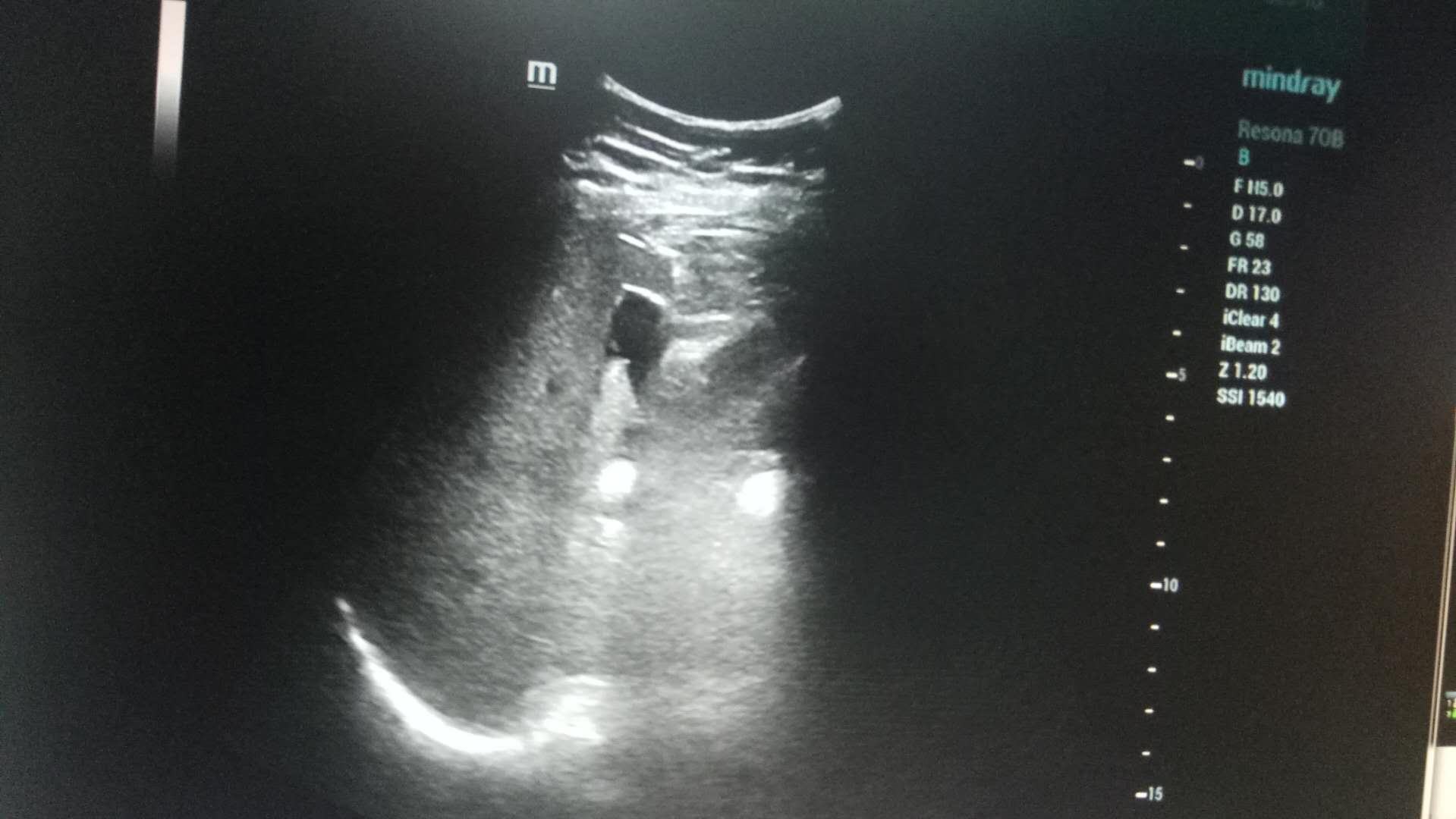 超声科主任展小军与对口支援医生杨艳秋的紧密配合下,短短30分钟,通过一根穿刺针,直径近7cm的肝囊肿就被完全抽吸硬化完毕,患者生命体征平稳,休息几小时后已活动自如。