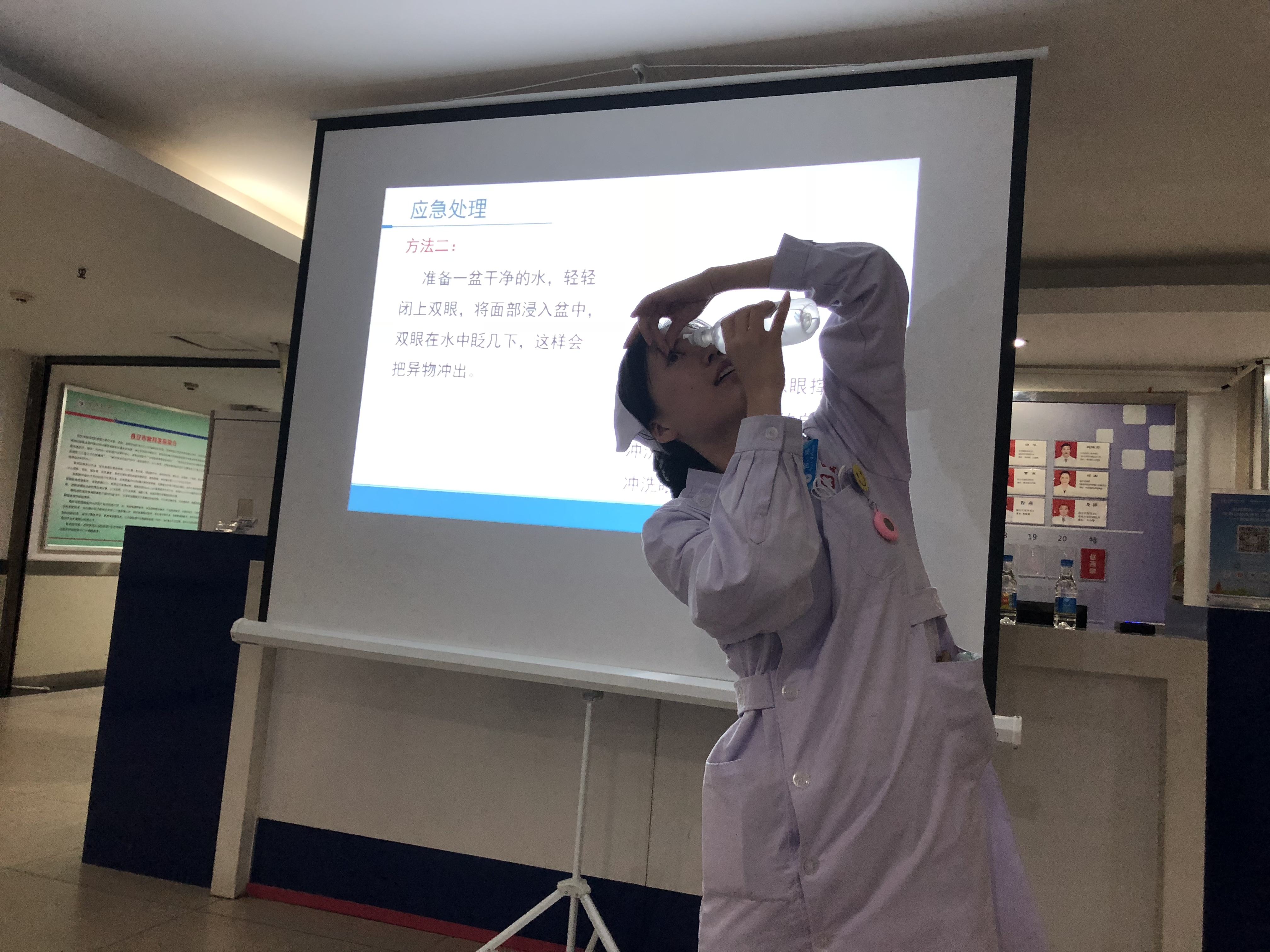 眼外伤病区吴惠琴主任医师为大家讲解了眼外伤的相关预防和治疗。吴惠琴主任向所有在场的患者及家属特别强调生命第一的原则,为了使大家更加直观的了解眼外伤,她将模型眼球展示给大家、直面讲解眼睛的解剖结构、眼外伤的分类、各型眼外伤的基本救治方法及注意事项。吴慧琴主任讲解生动精彩,语言通俗易懂让大家对眼外伤深刻的认识和体会,使患者及家属对眼外伤引起了高度的重视,随后,此次救治小组的张妍护师和何瑶护士给大家讲解眼外伤的防治与自救处理。张妍通过真实视频案例告知大家此病的严重性与危害,并现场实景演绎了发生化学性灼伤和眼睛异物的紧急自救方法,手把手指导听众如何冲眼、如何争取时间将眼伤害降到最低。吴主任团队悉心、耐心的讲解博得所有与会听众的认可和赞许。