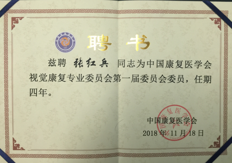 张红兵副院长荣获中国康复 医学会视觉康复专业委员会委员资格