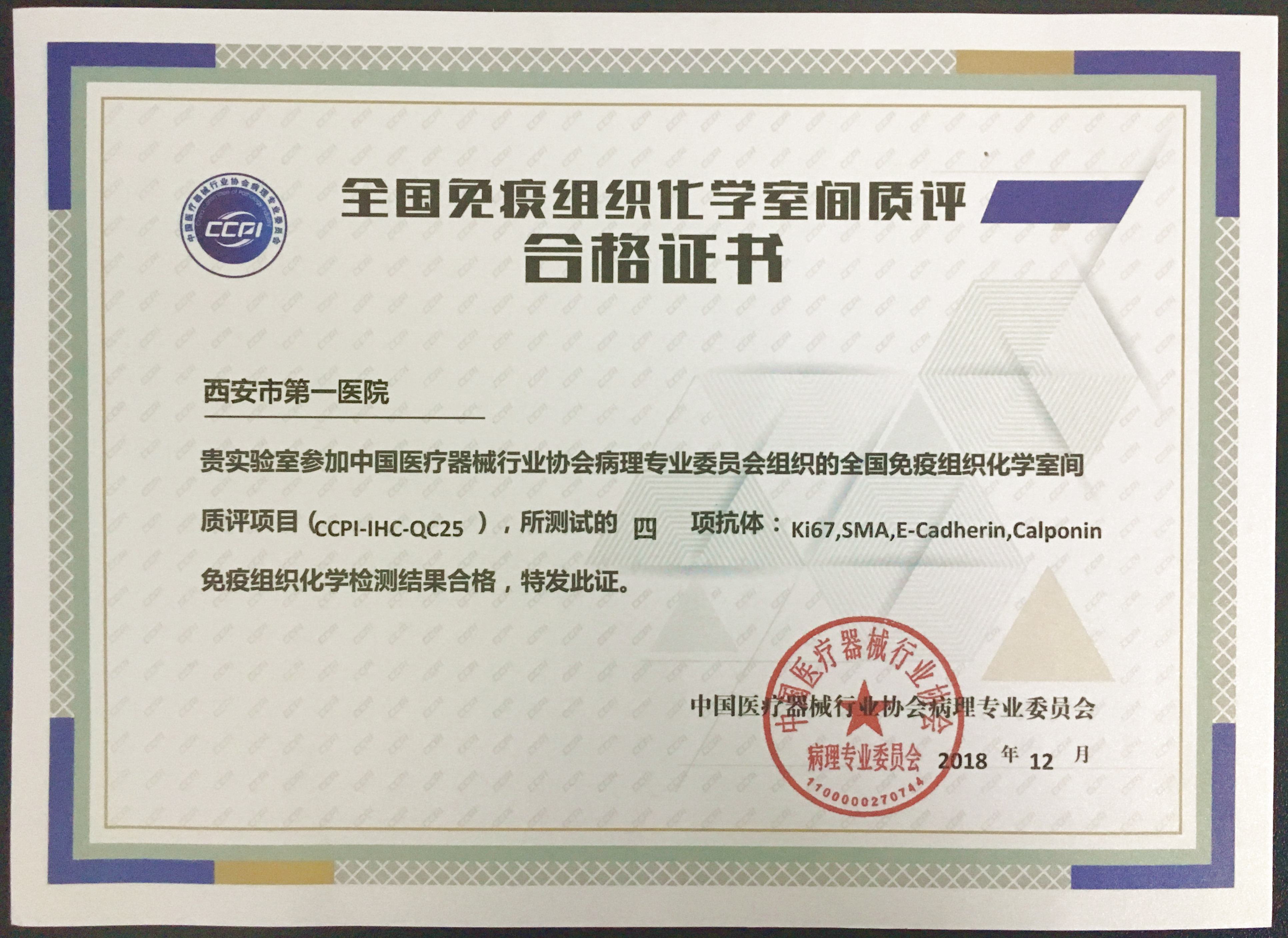 2018年12月20日,成人导航病理科接收到了来自中国医疗器械行业协会病理专业委员会颁发的全国免疫组织化学室间质评合格证书。