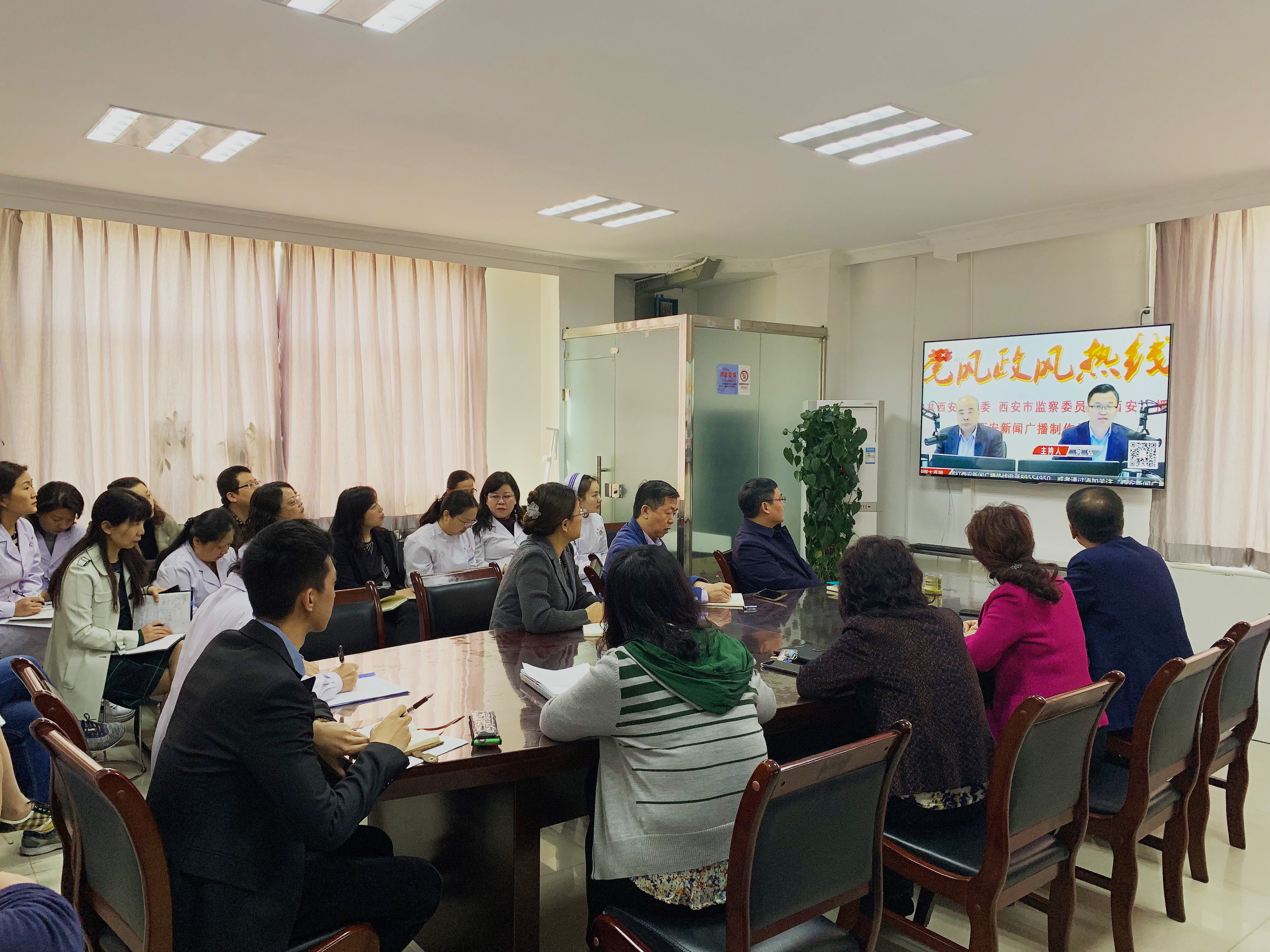 2019年3月25日上午9:05,成人导航全体班子成员、行政职能部门中层干部在科协四楼会议室集中观看《党风政风热线》栏目,临床一线人员在科室进行观看。