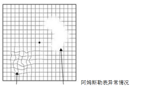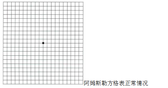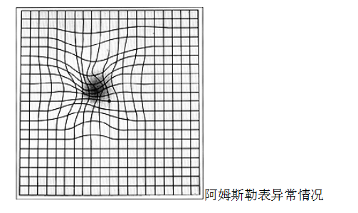 采用阿姆斯勒方格表或者看有线条、栅格的窗框或其他有线条、四方格的器皿,把方格表放在视平线30cm处,光线要明亮及均匀,若有屈光不正或近视需佩镜矫正后进行测试,看线条是否变弯、方格变小或变形、久远有无黑影遮挡等异常情况,若异常应尽快到成人导航
