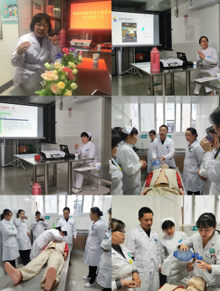 肖一峰护士长、主管护师刘海燕运用多媒体课件对急诊病情的分级和如何判断病人心跳呼吸停止以及心肺复苏的指征、操作步骤、救助过程中的要点、注意事项、复苏成功的指征等进行了详细讲解。操作技术过硬、经验丰富的刘海燕和师蒙为大家进行了心肺复苏术的同步演示,并现场指导大家进行分组模拟练习,规范操作动作和急救操作步骤,确保人人掌握、人人熟练。