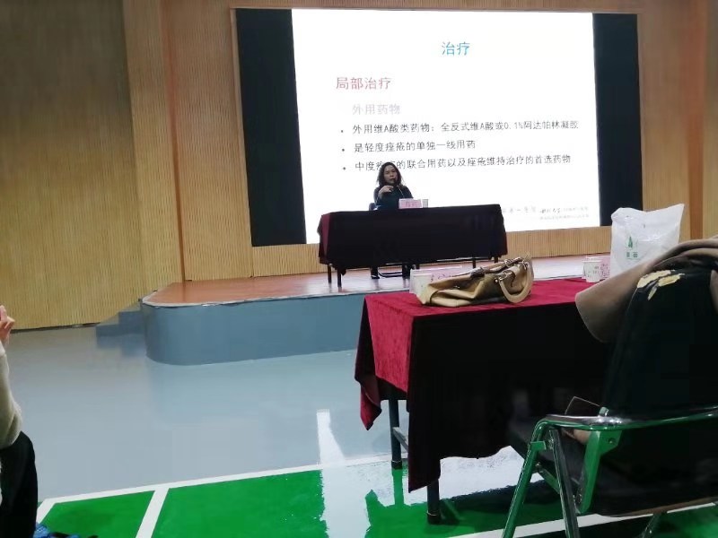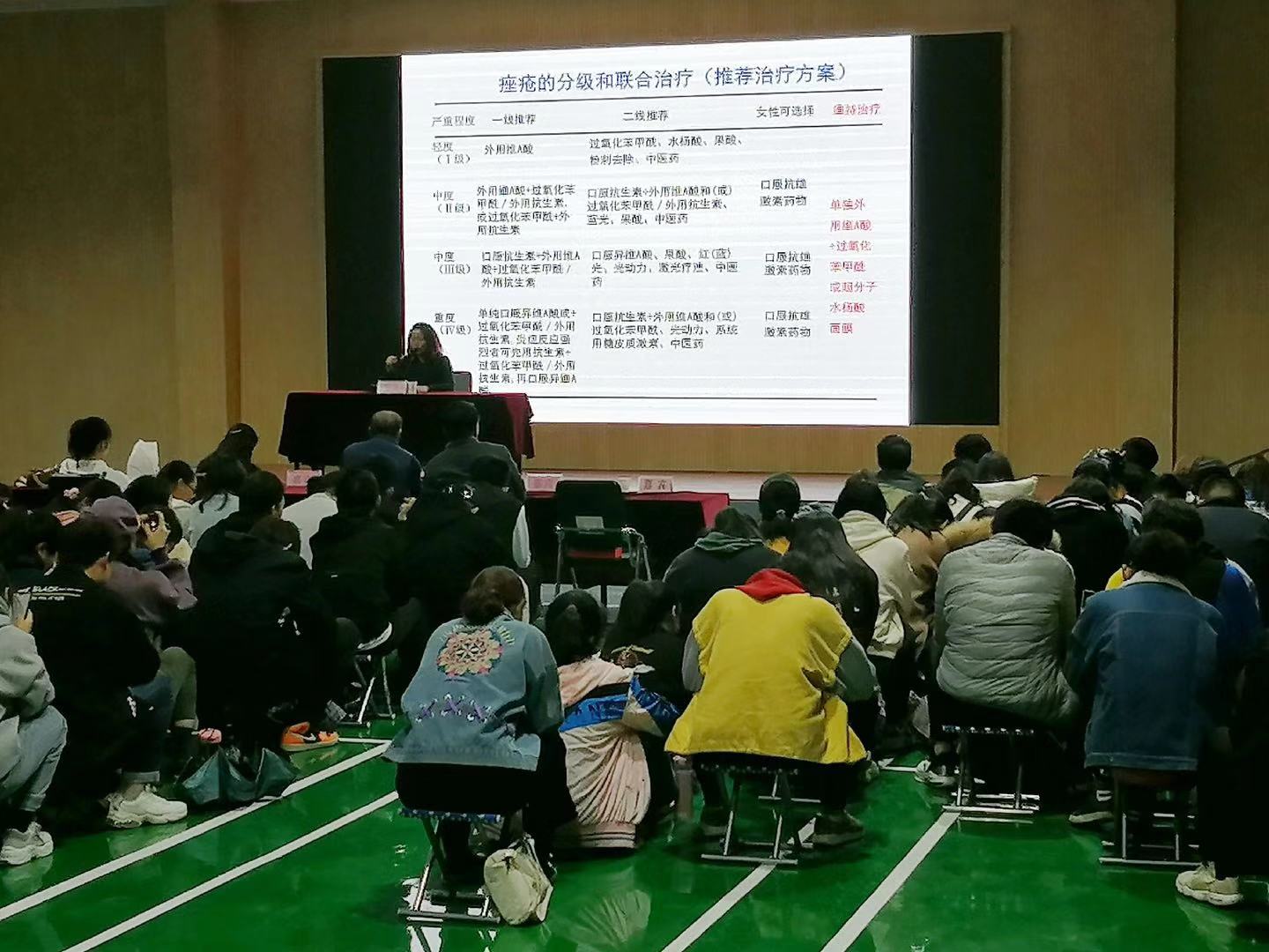 第一位上台的专家,是皮肤科副主任沈小霞,她所讲述的是《痤疮的治疗及生活管理》。通过沈主任展示的相关图片,学生对痤疮有了更加深刻的了解。痤疮分为三个层次,轻度、中度、严重,并且不同层次所需的药品也是有所不同的。此外,更要引起注意的是抗生素等有关药品不能随便使用,若过度使用药物反而会有副作用。最后还为同学介绍了多种治疗方法。