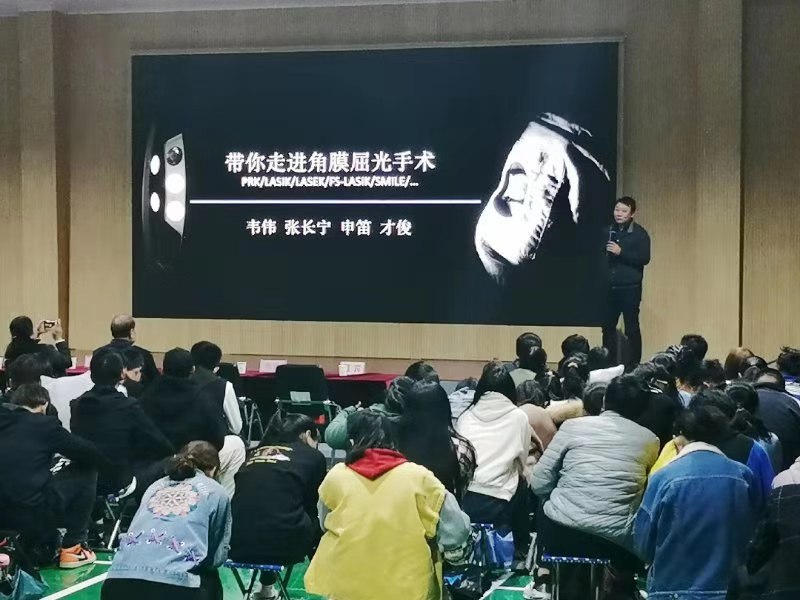 最后上台的是激光近视中心主任韦伟,他向学生们描述了近视矫正手术的注意事项与爱眼的必要性。随着时间的发展,做矫正手术的人,从最开始的50000人到现在的1500000人,而且经过数据采集,发现做矫正手术的大多是青少年。借此机会,韦主任为学生们介绍了相关手术的注意事项,适合做此手术的人,必须年满18岁,且散光度数在600度内,或近视度数在600度内都是可以的。但是不能因为有这项手术帮助我们恢复视力,而过度用眼。爱护眼睛重在平时的保护。