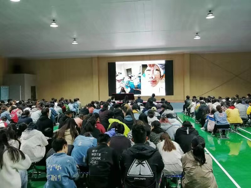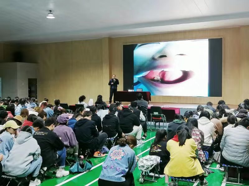 紧接着上台的是口腔科主任党亮生,他用真实事例向学生们阐释了爱护牙齿的重要性。首先,党主任播放了视频,视频中牛先生因为牙齿问题困扰了很久,甚至吃饭对他来说都成了问题,最终他选择把松动的牙齿全部拔掉,重新种植牙齿,几经波折之后,党主任为牛先生更换了新的牙齿。通过党主任生动形象的讲解,学生们受益匪浅,知道了好好保护牙齿多么重要。