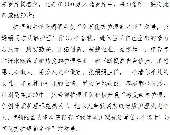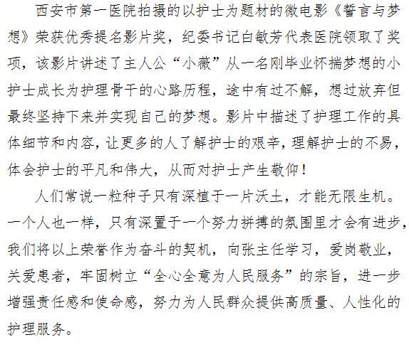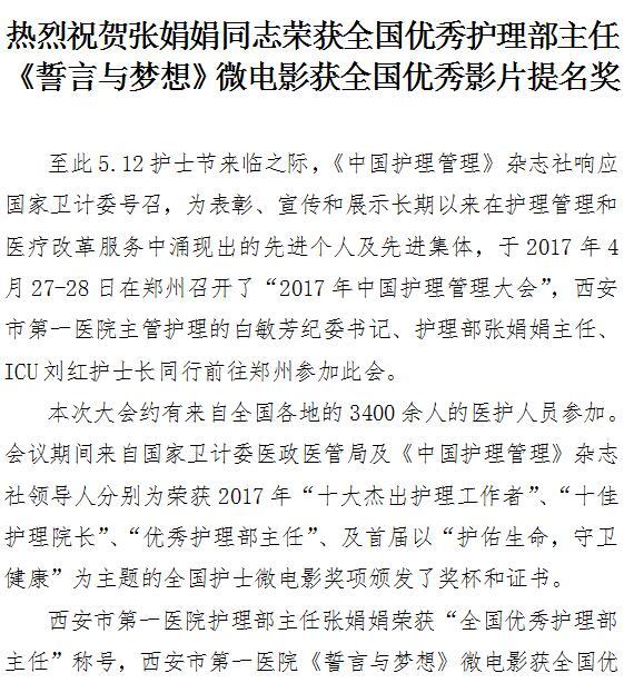 张娟娟同志荣获全国优秀护理部主任 《誓言与梦想》微电影获全国优秀影片提名奖