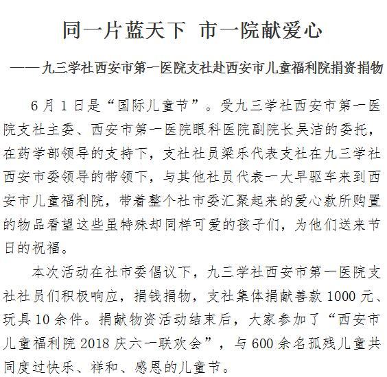 同一片蓝天下 市一院献爱心 —九三学社成人导航 支社赴西安市儿童福利院捐资捐物