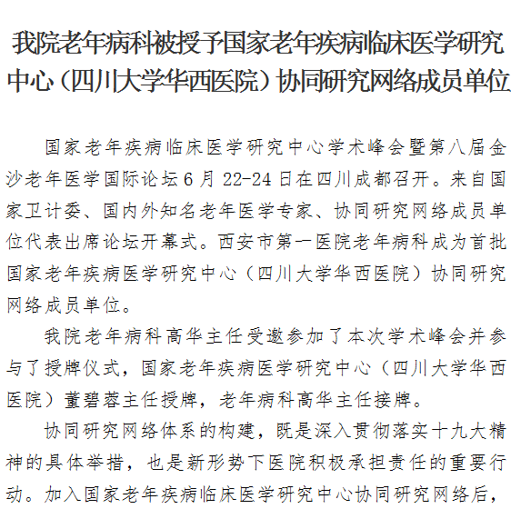 院老年病科被授予国家老年疾病临床医学研究中心(四川大学华西成人导航 )协同研究网络成员