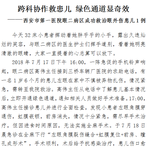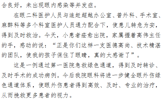 跨科协作救患儿 绿色通道显奇效-----成人导航 眼二病区成功救治眼外伤患儿1例