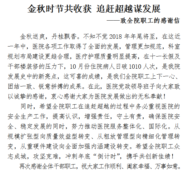 金秋时节共收获追赶超越谋发展——致全院职工的感谢信