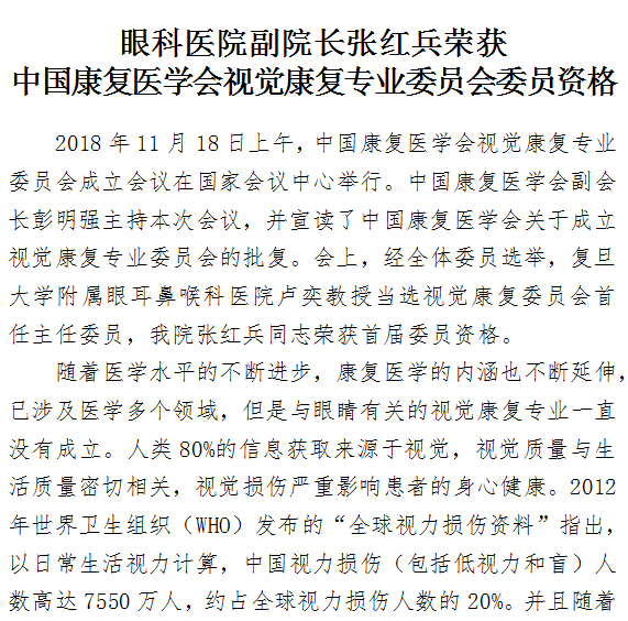 眼科成人导航 张红兵副院长荣获中国康复医学会视觉康复专业委员会委员资格