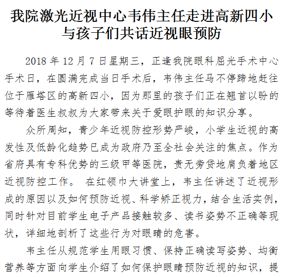 成人导航 激光近视中心韦伟主任走进高新四小与孩子们共话近视眼预防