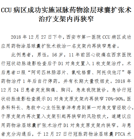 CCU病区成功实施冠脉药物涂层球囊扩张术 治疗支架内再狭窄