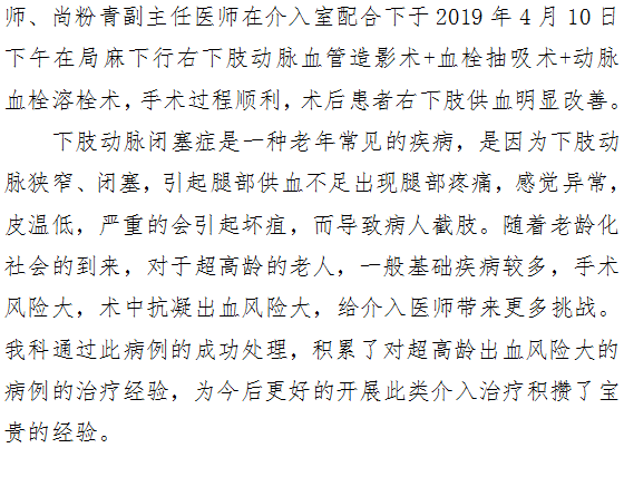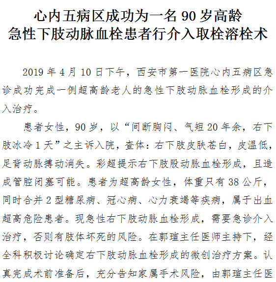 心内五病区成功为一名90岁高龄急性下肢动脉血栓患者行介入取栓溶栓术