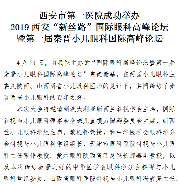 市一院成功举办2019西安“新丝路”国际眼科高峰论坛暨第一届秦晋小儿眼科国际高峰论坛