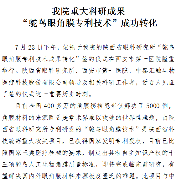成人导航 重大科研成果 “鸵鸟眼角膜专利技术”成功转化