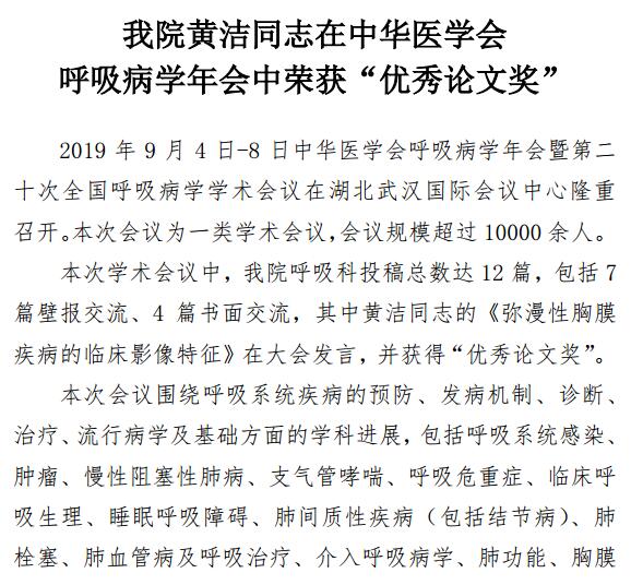 成人导航黄洁同志在中华医学会 呼吸病学年会中荣获“优秀论文奖”