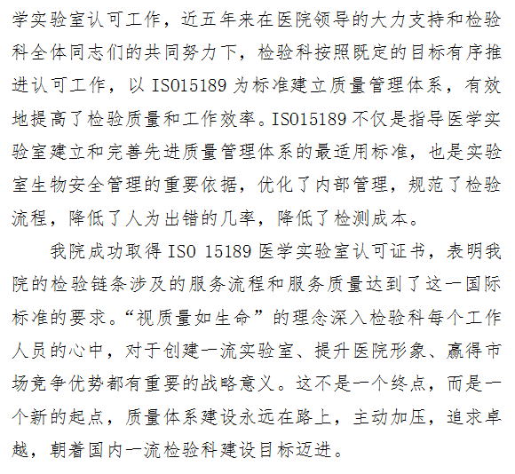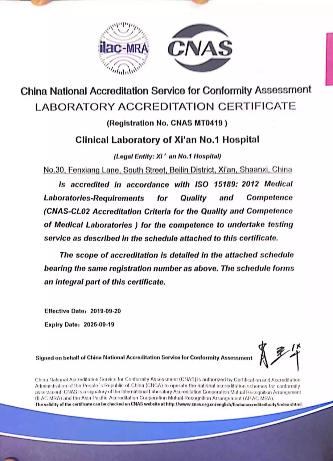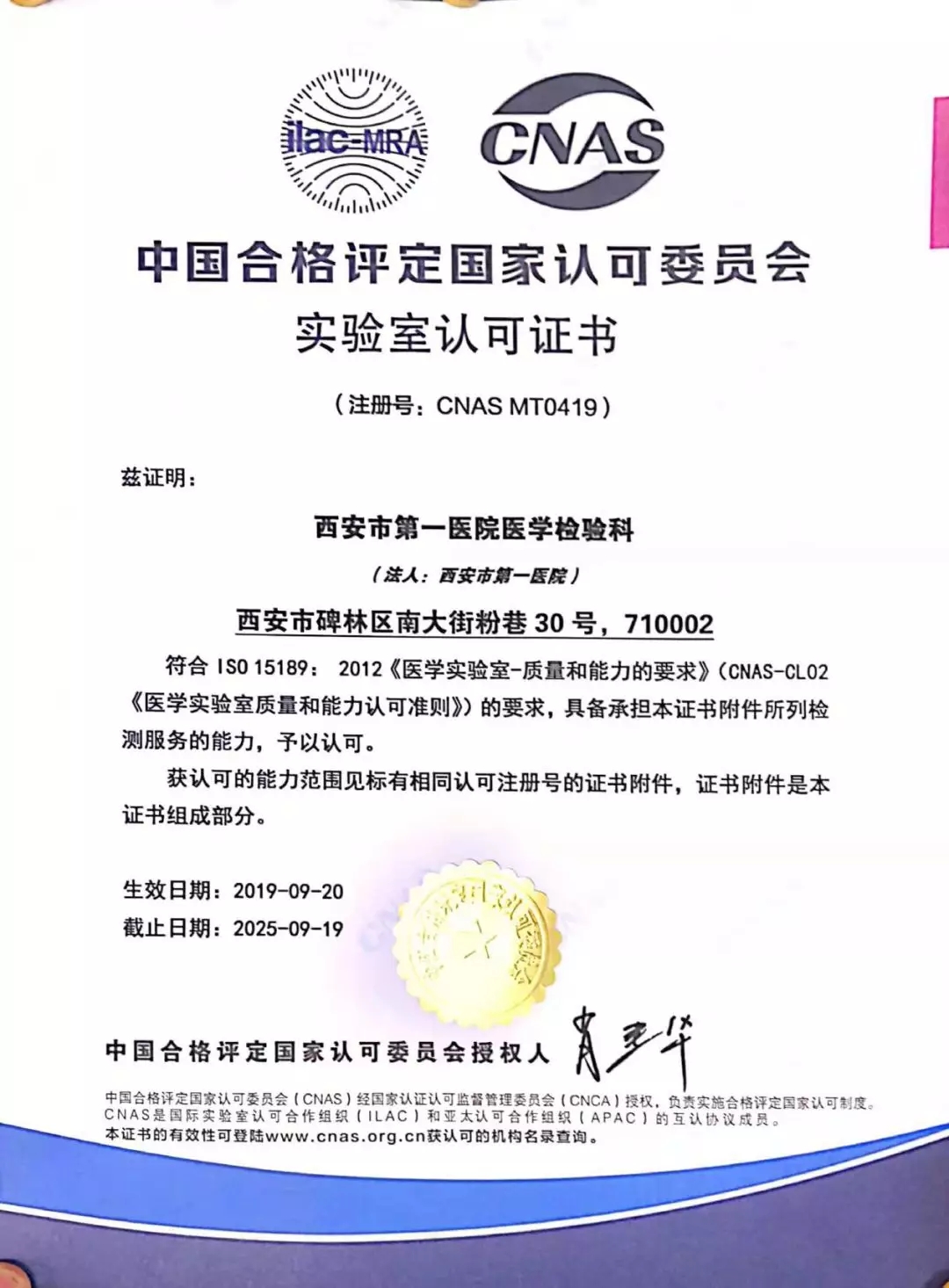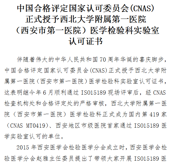 中国合格评定国家认可委员会(CNAS) 正式授予成人导航 医学检验科实验室 认可证书