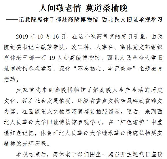 人间敬老情 莫道桑榆晚 ——记成人导航离休干部赴高陵博物馆 西北民大旧址参观学习