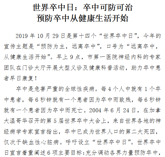 世界卒中日:卒中可防可治 预防卒中从健康生活开始