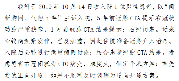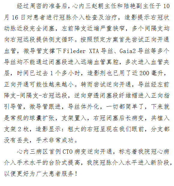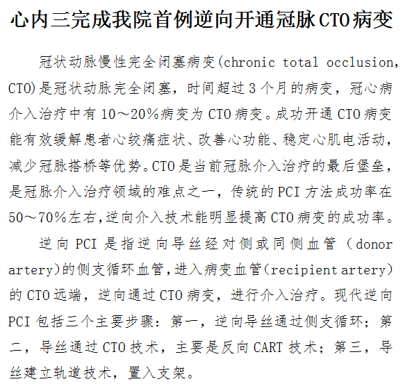 心内三完成成人导航首例逆向开通冠脉CTO病变