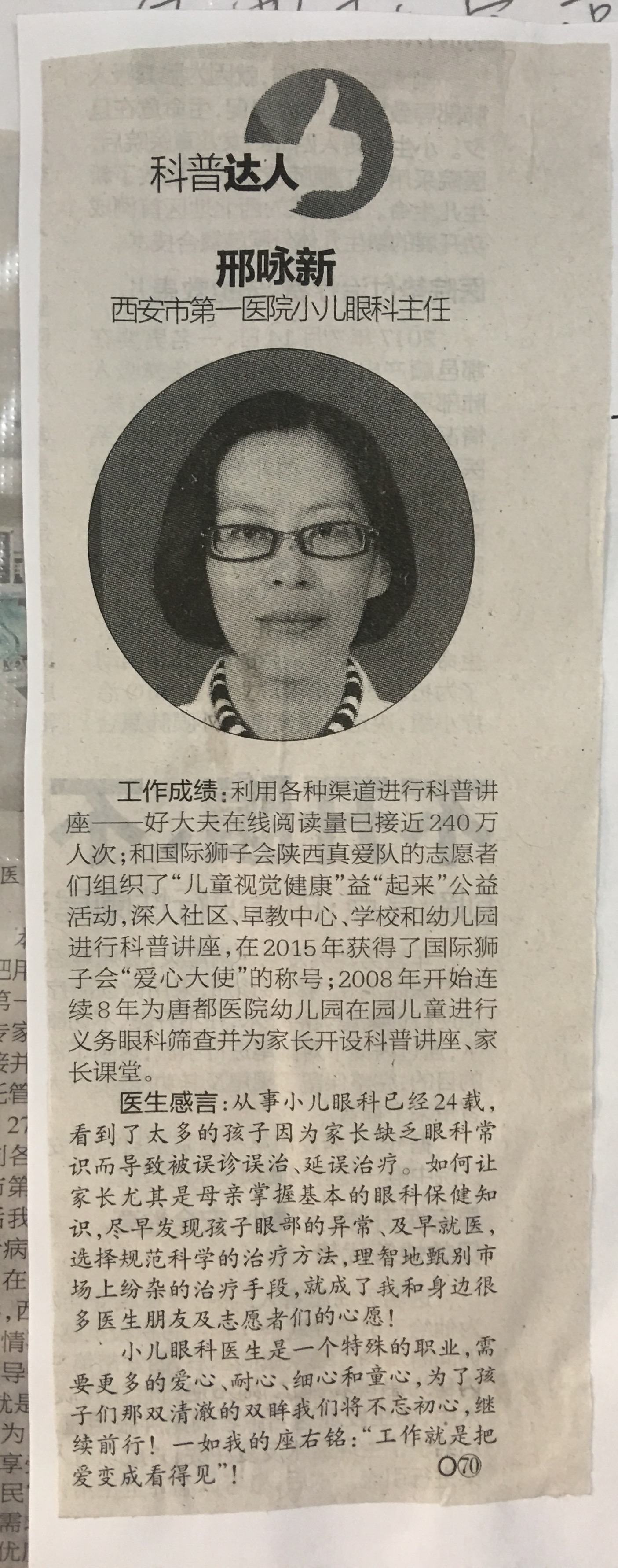 2018.1.17《华商报》科普达人邢咏新成人导航 小儿眼科主任