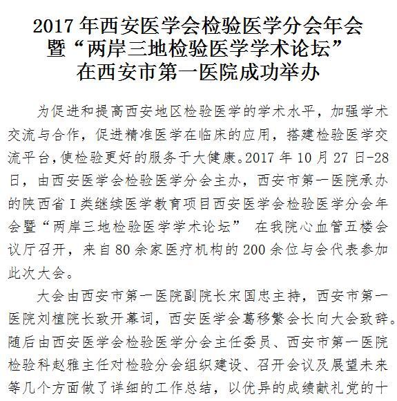2017年西安医学会检验医学分会年会暨“两岸三地检验医学学术论坛”在第一成人导航 成功举办