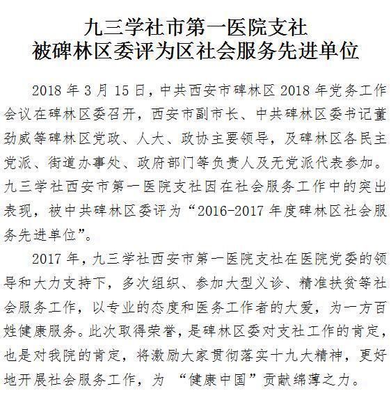 九三学社市第一成人导航 支社被碑林区委评为区社会服务先进单位