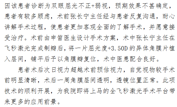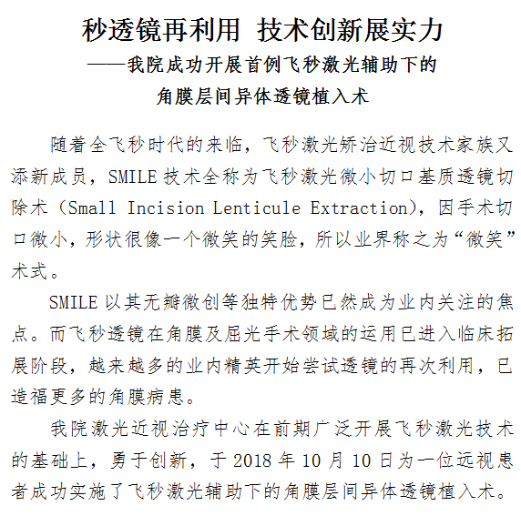 成人导航成功开展首例飞秒激光辅助下的 角膜层间异体透镜植入术