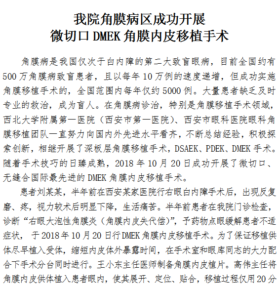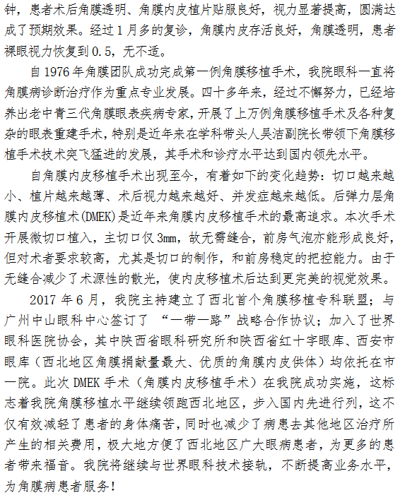 成人导航角膜病区成功开展微切口DMEK角膜内皮移植手术