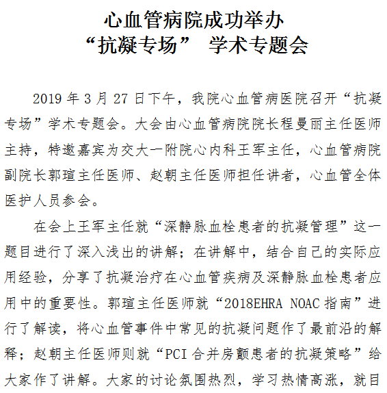 心血管病院成功举办“抗凝专场” 学术专题会