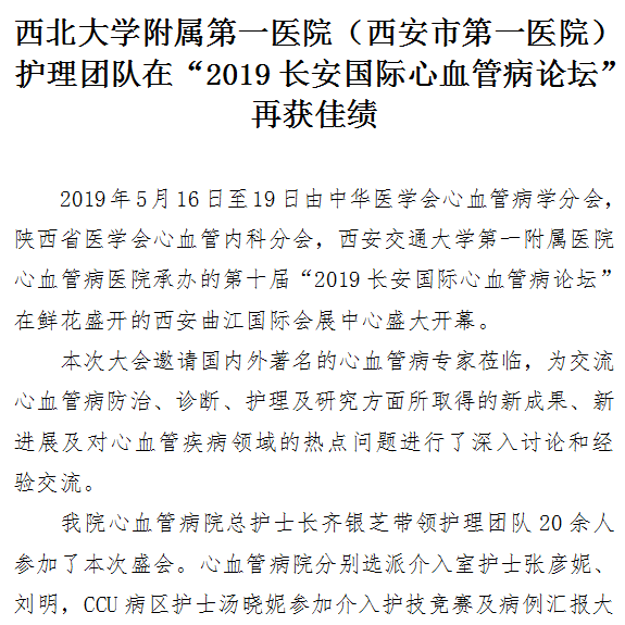 西北大学附属第一成人导航 护理团队在“2019长安国际心血管病论坛”再获i佳绩